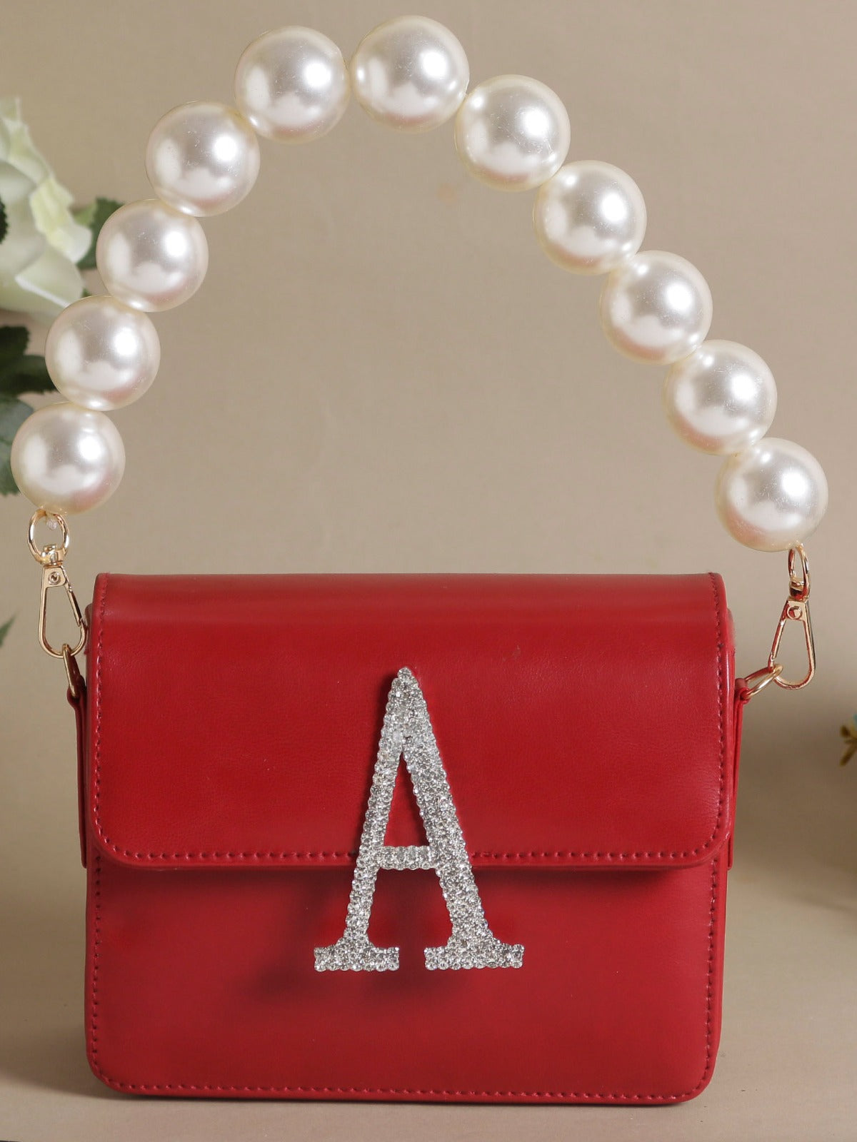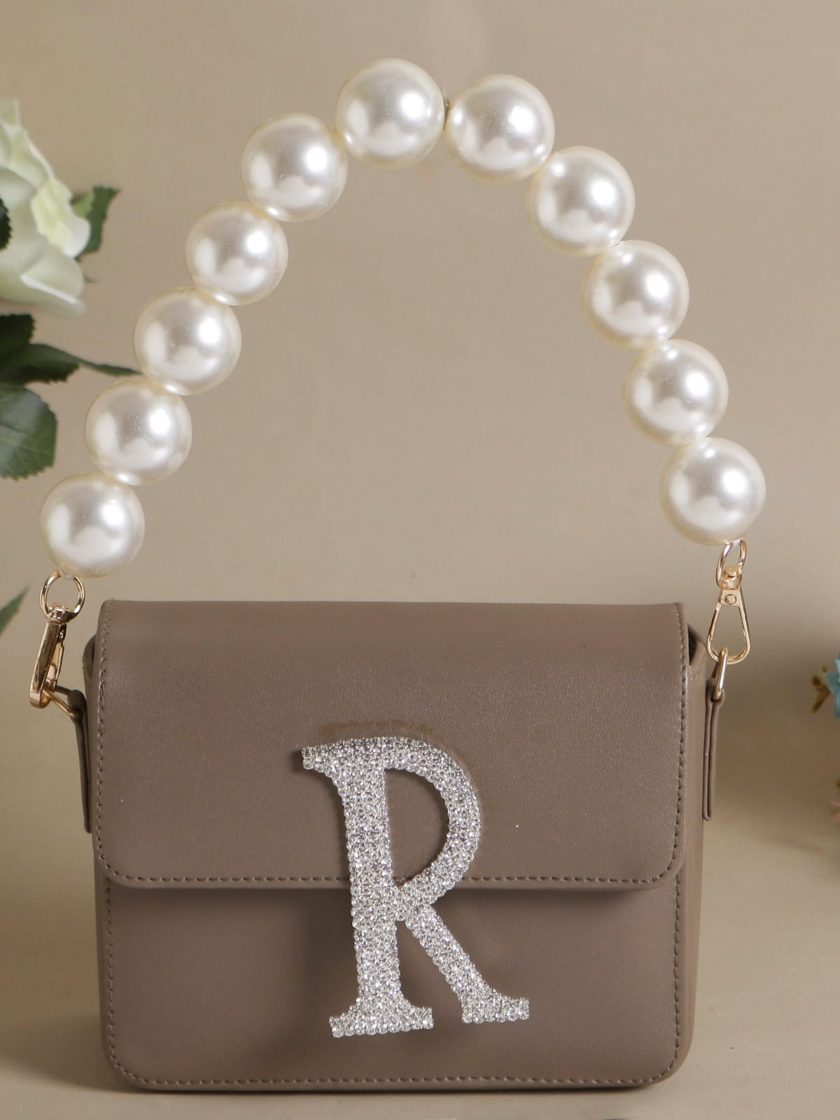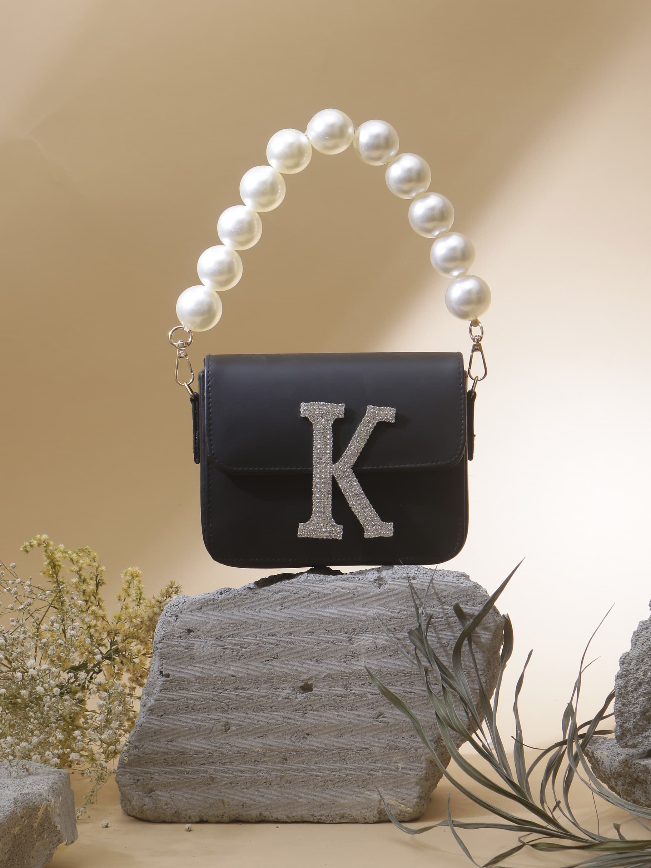New Initial Clutch Bag in Rexin Fabric with Pearl Sling Chain