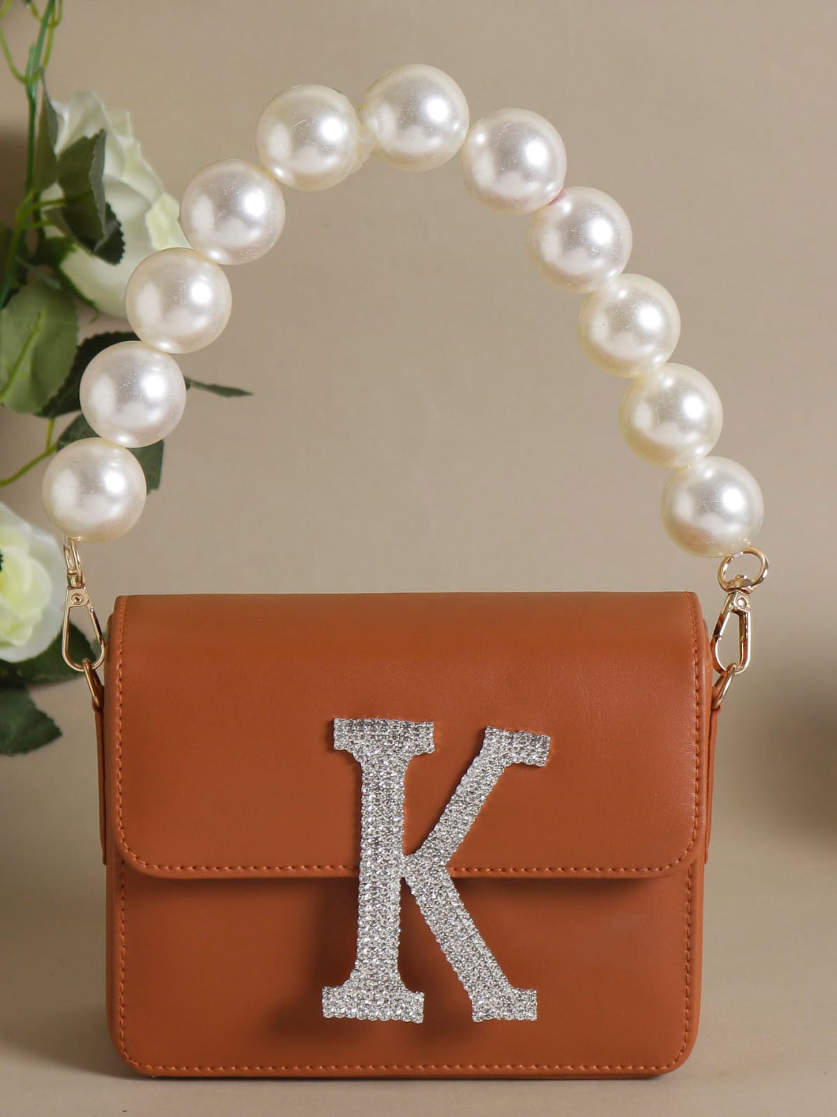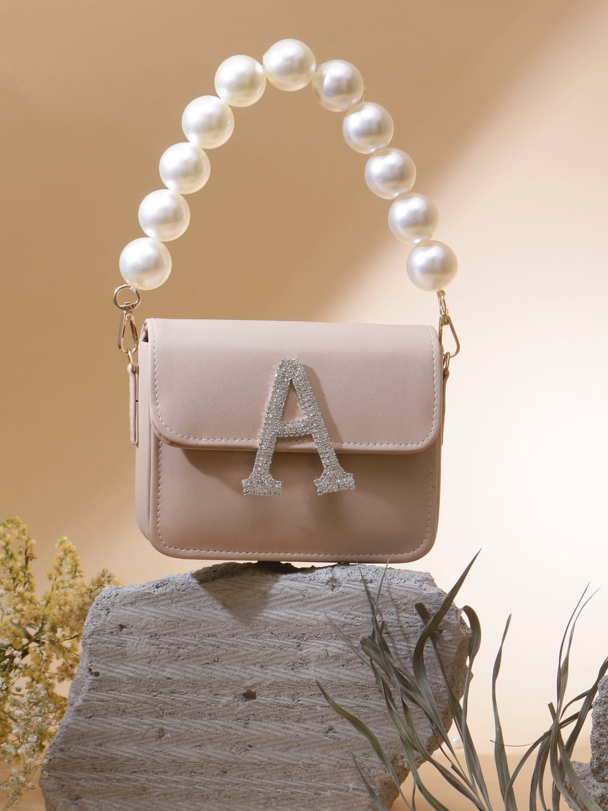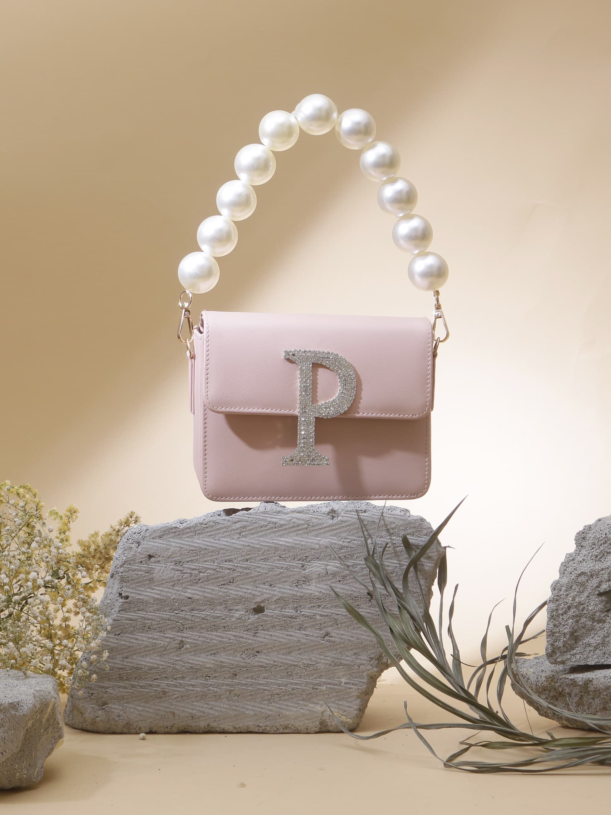 New Initial Clutch Bag in Rexin Fabric with Pearl Sling Chain