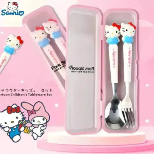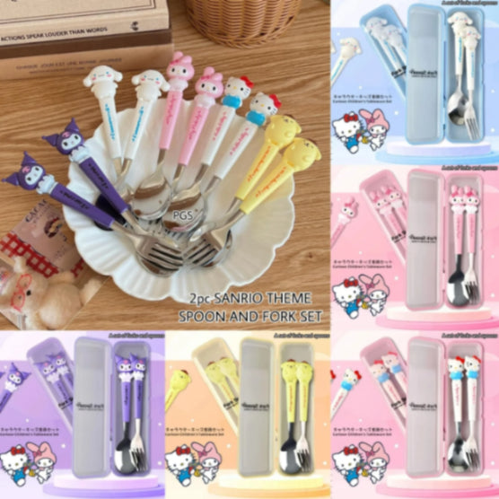 Sanrio Theme Spoon and Fork Set Cutlery Set: Children’s flatware set (spoon, fork), storage box. Perfect for any everyday meal. Hygienic and durable stainless steel dinne. Theme: Cartoons Material: The fork and spoon are made of stainless steel.