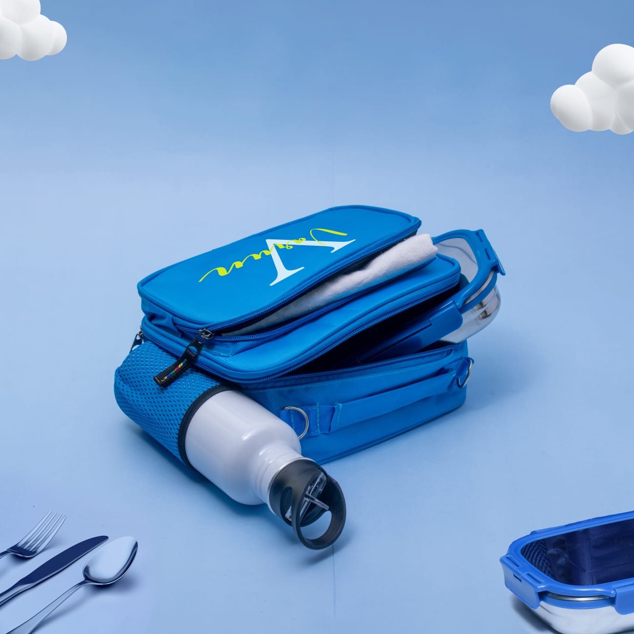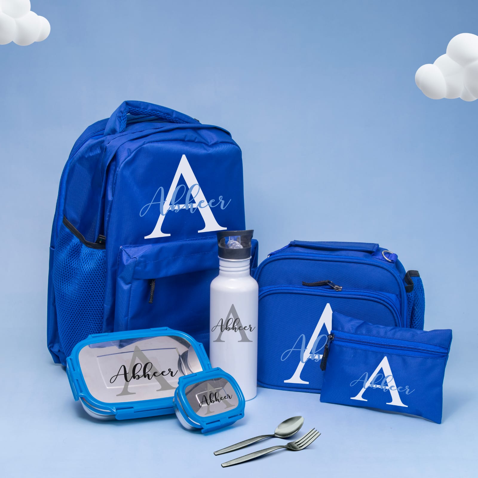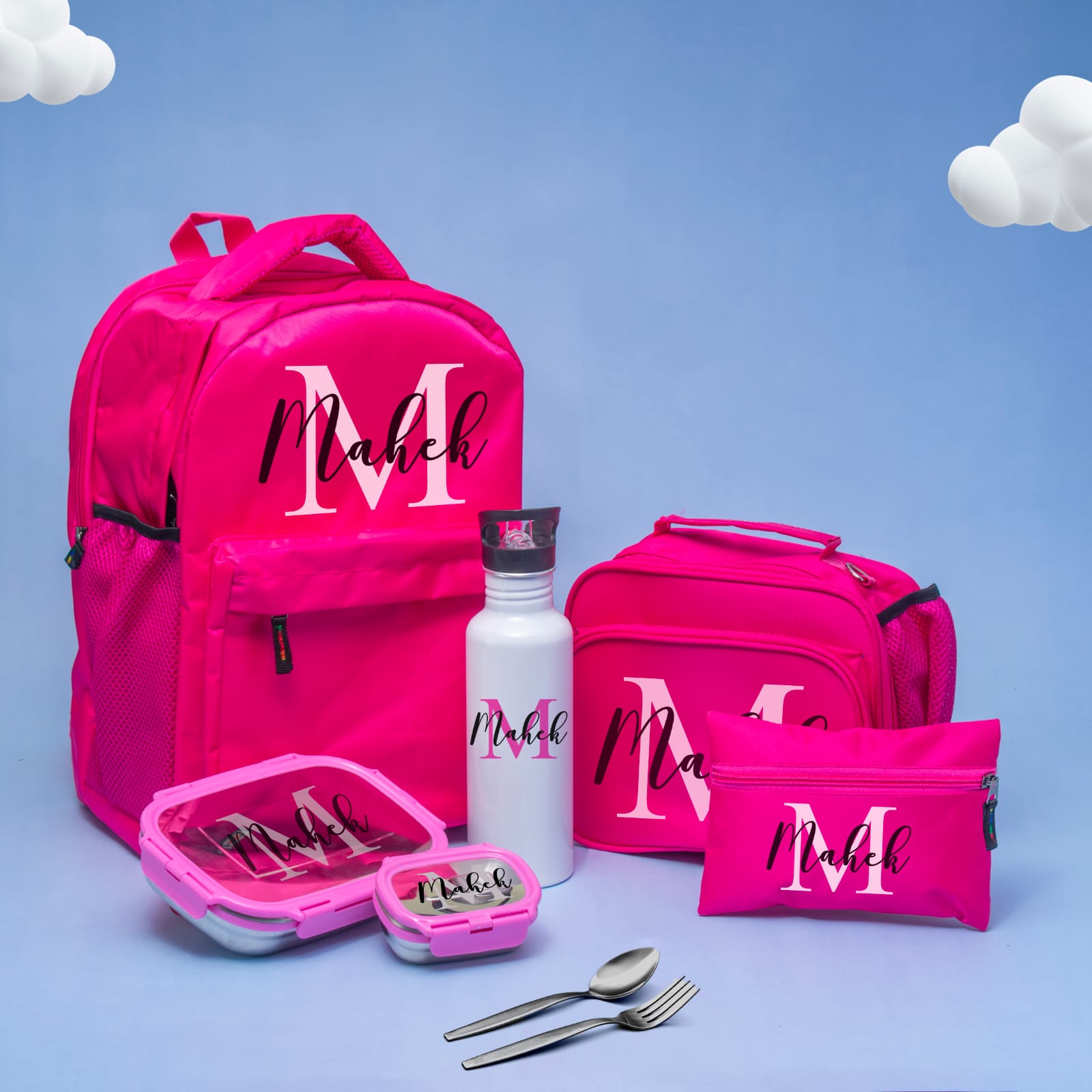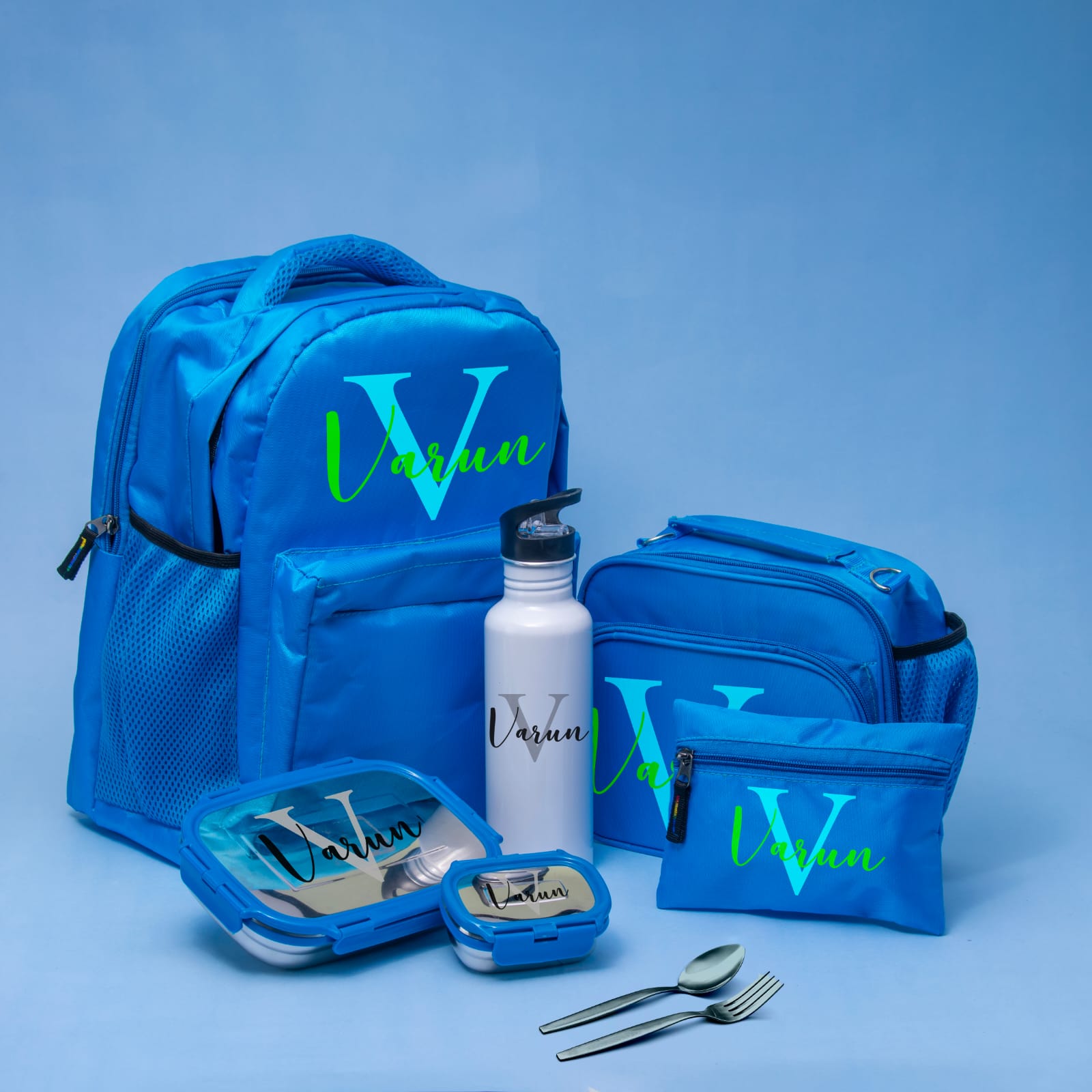 School bagTiffin bagSmall pouchSipperJumbo tiffinFork and spoon