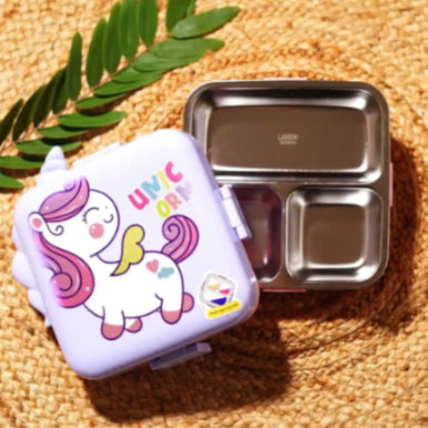 Make mealtime fun and hassle-free with this Personalized Unicorn Theme Stainless Steel Lunch Box for Kids. Featuring three compartments, it keeps food fresh and organized while preventing spills with its leakproof seal. The included stainless steel cutlery and sauce box make it perfect for school, outings, or travel. Personalisation adds a unique touch, making it an ideal gift for kids.