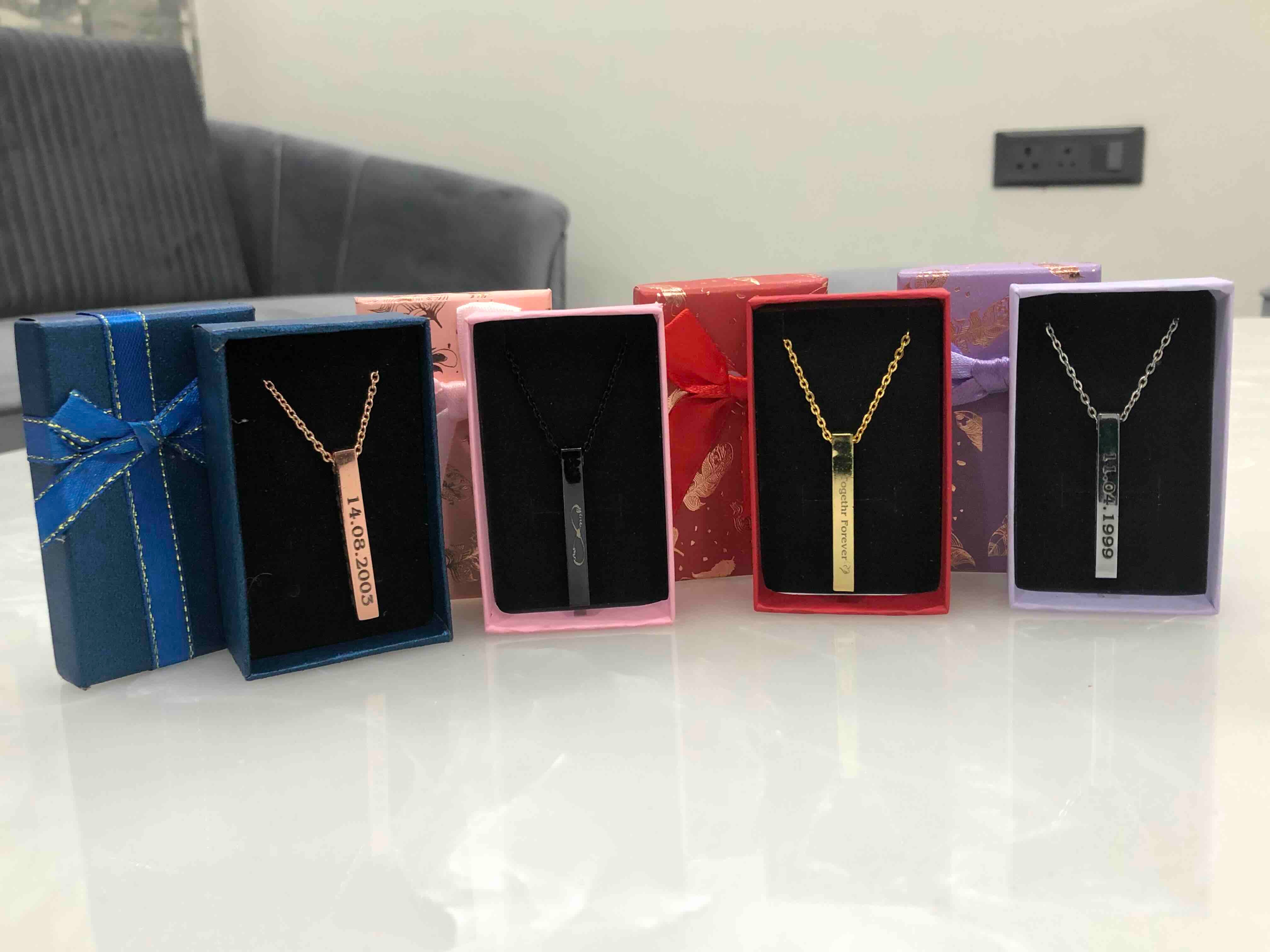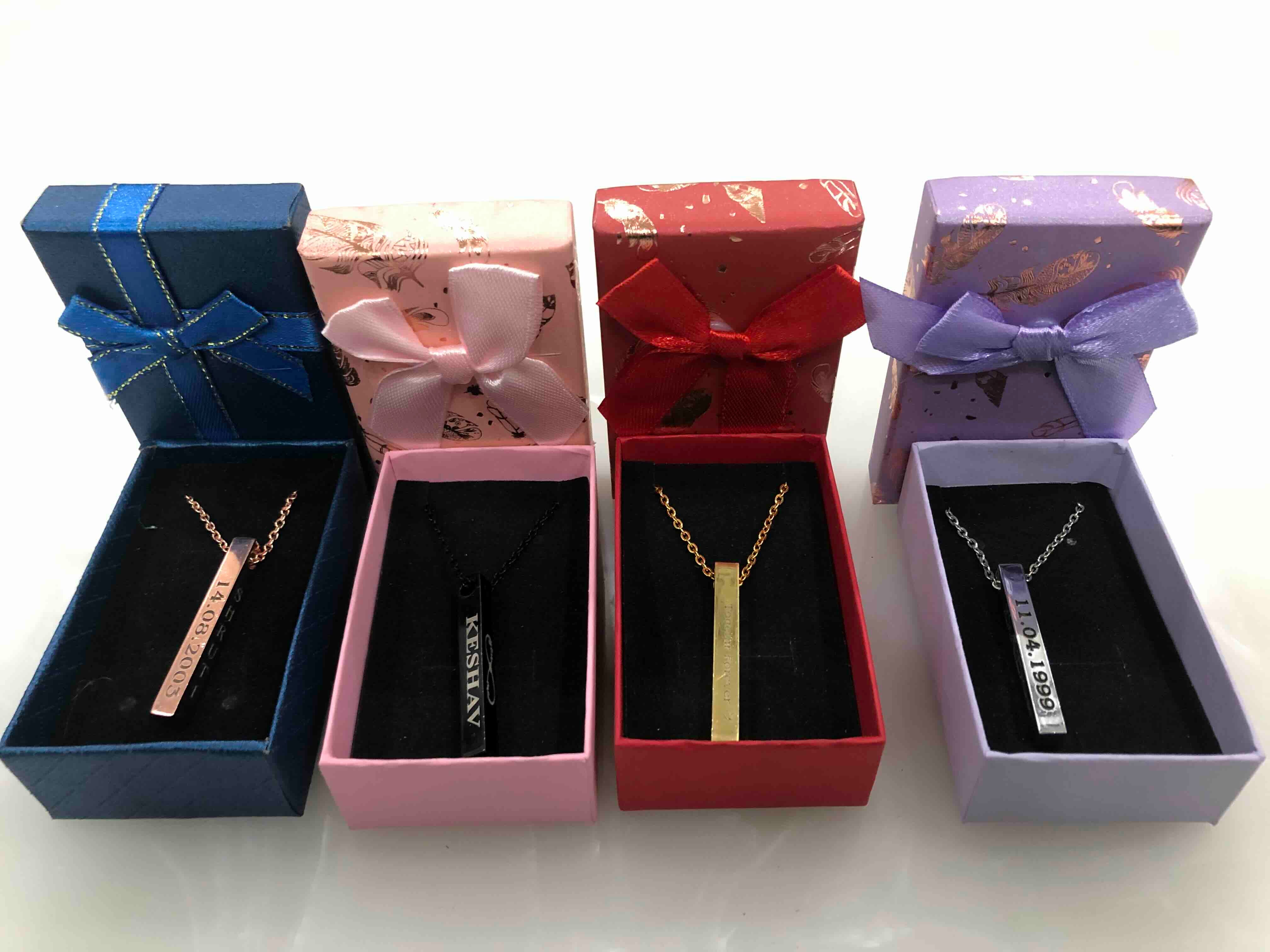 PERSONALISED METAL BAR PENDANT includes- *engraving on 4 sides *gift box packing price- 199+hlf kg ship note - in half kg parcel 5 pendant boxes can go.