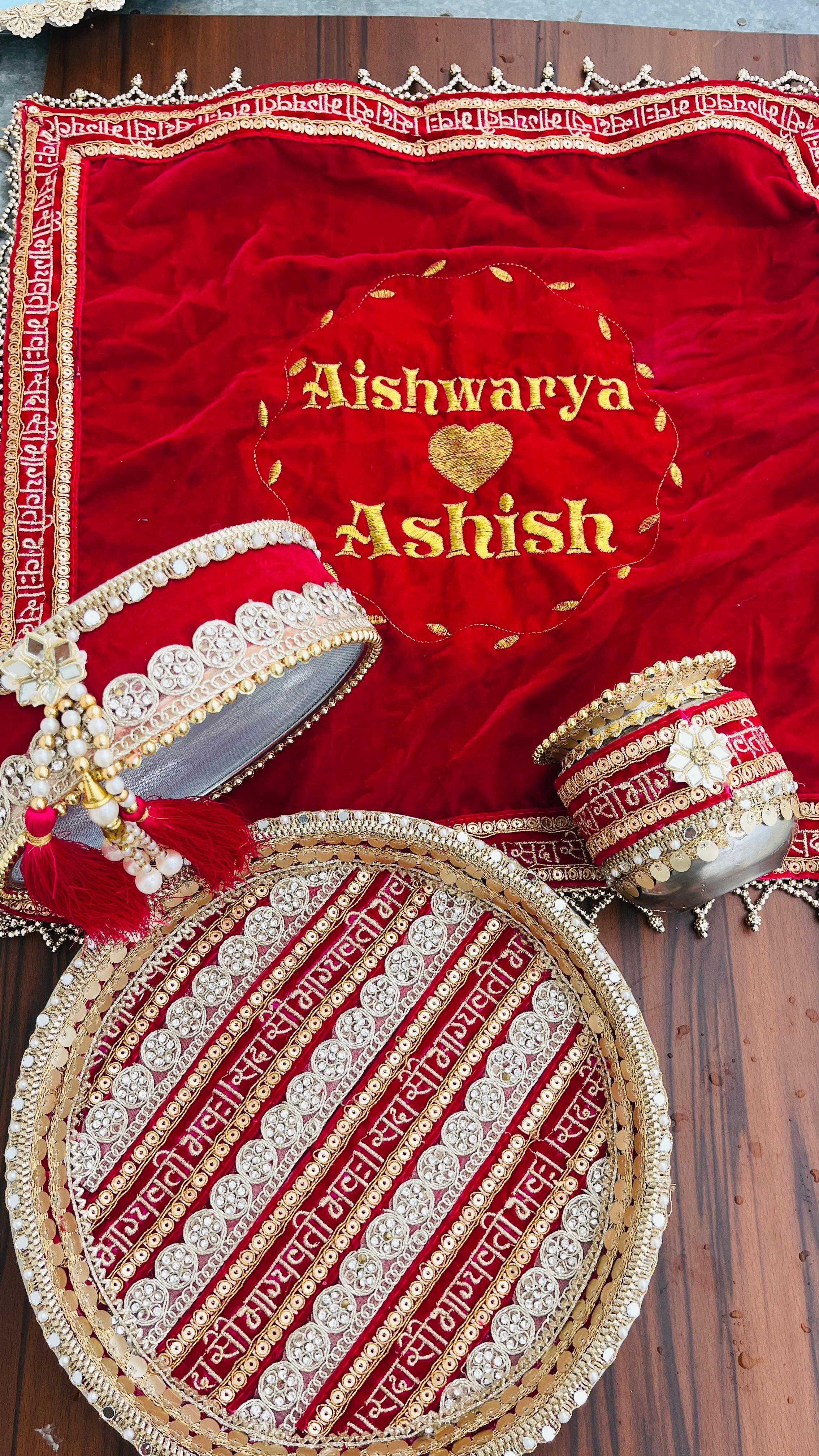 A luxurious, personalized thali set that combines elegance, tradition, and personalization—ideal for gifting or wedding ceremonies.