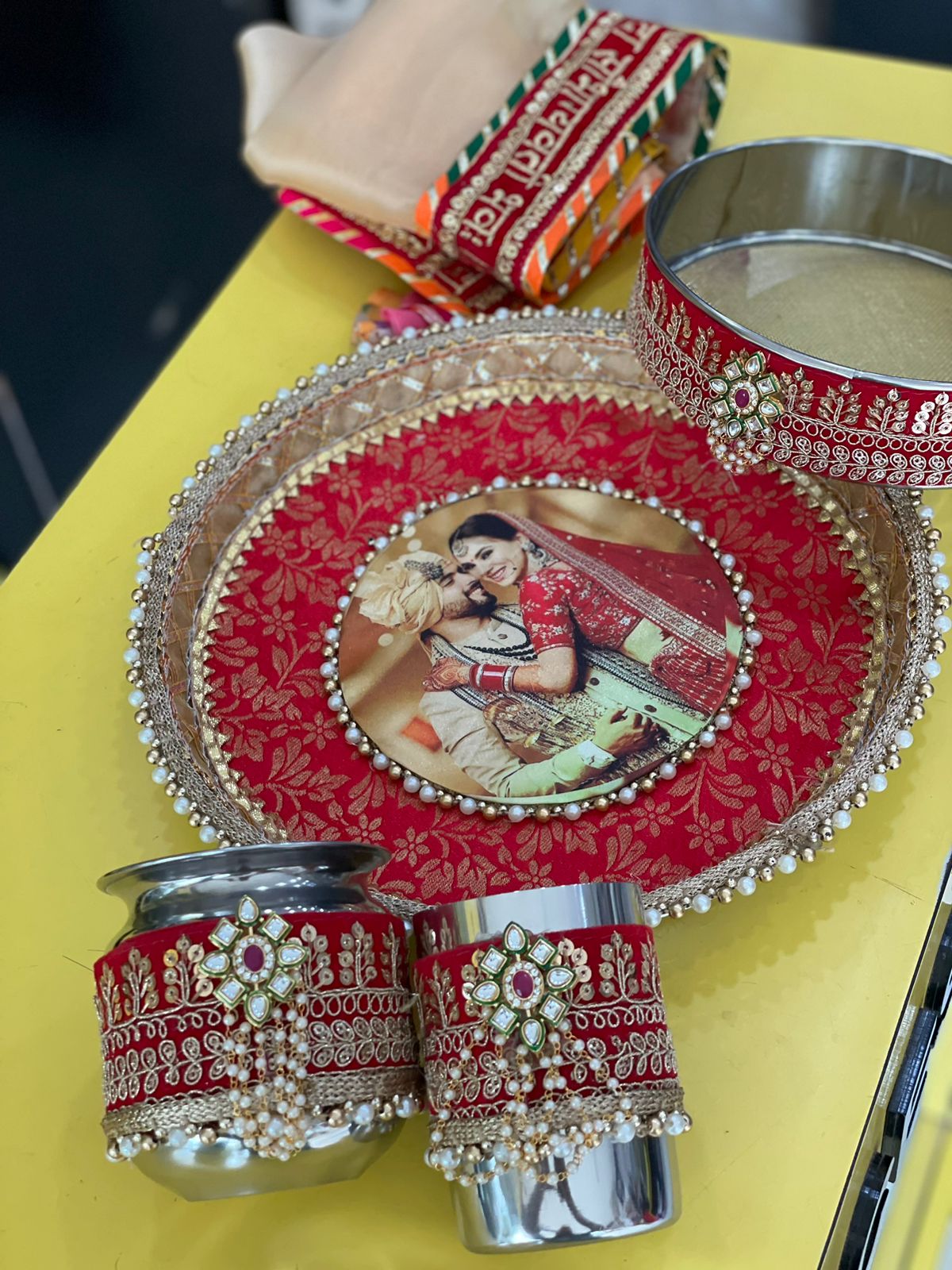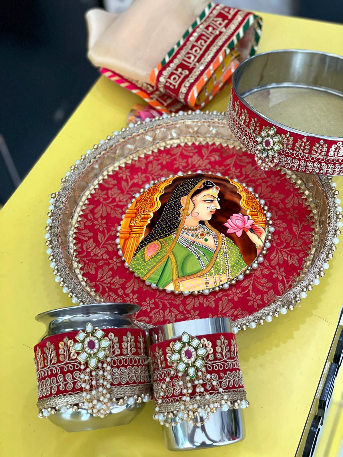 Maharani Karwachauth Thali Set – Zari, Kundan, and Moti Work