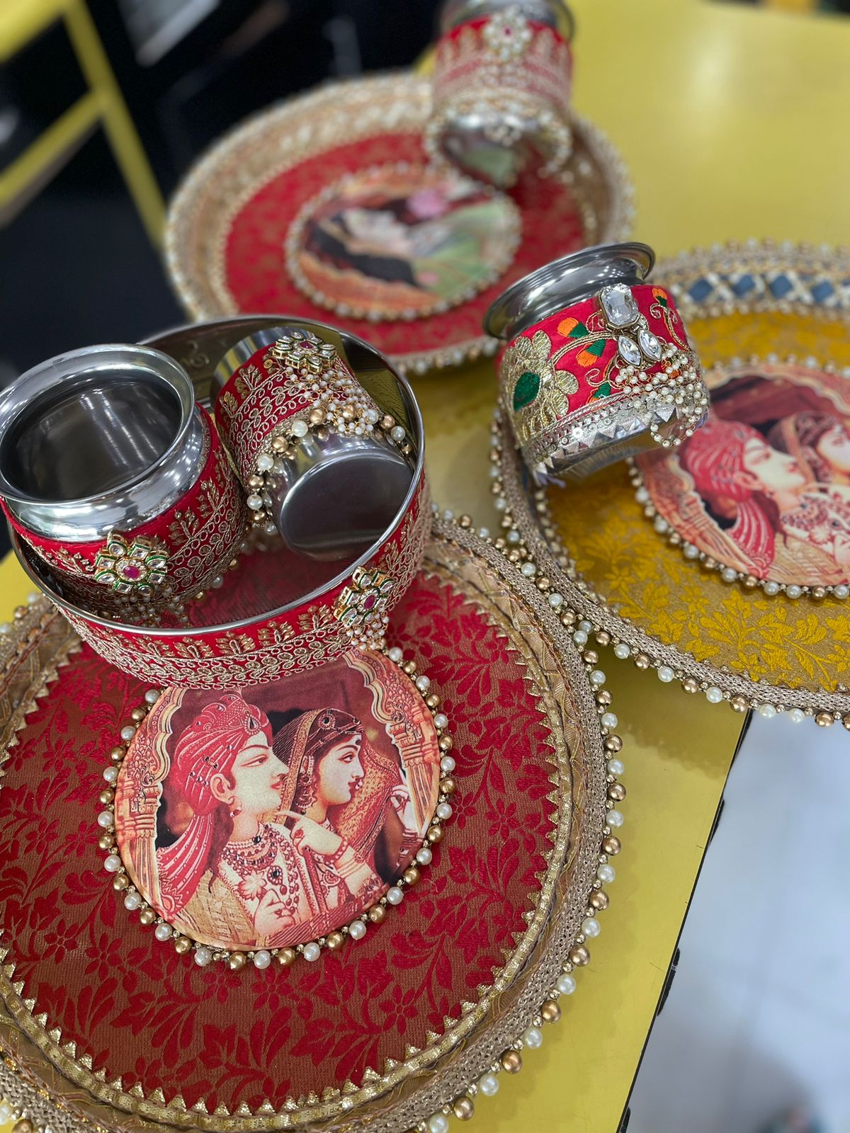 Celebrate Karwachauth with the Maharani Thali Set, featuring exquisite zari thread work, kundan brooches, gotta, and moti detailing. Crafted for premium quality and perfect finishing, this set is ideal for gifting or festive rituals.